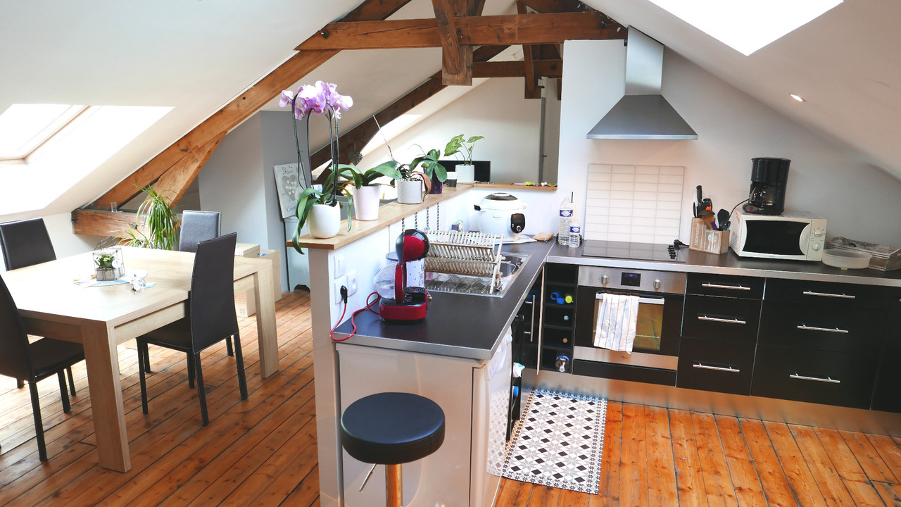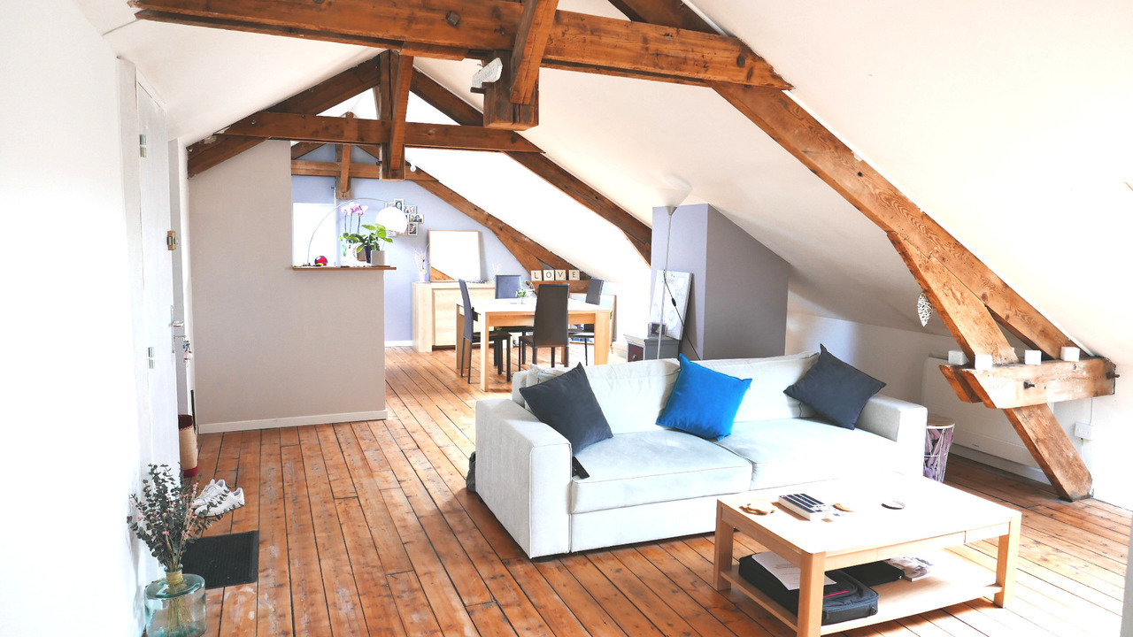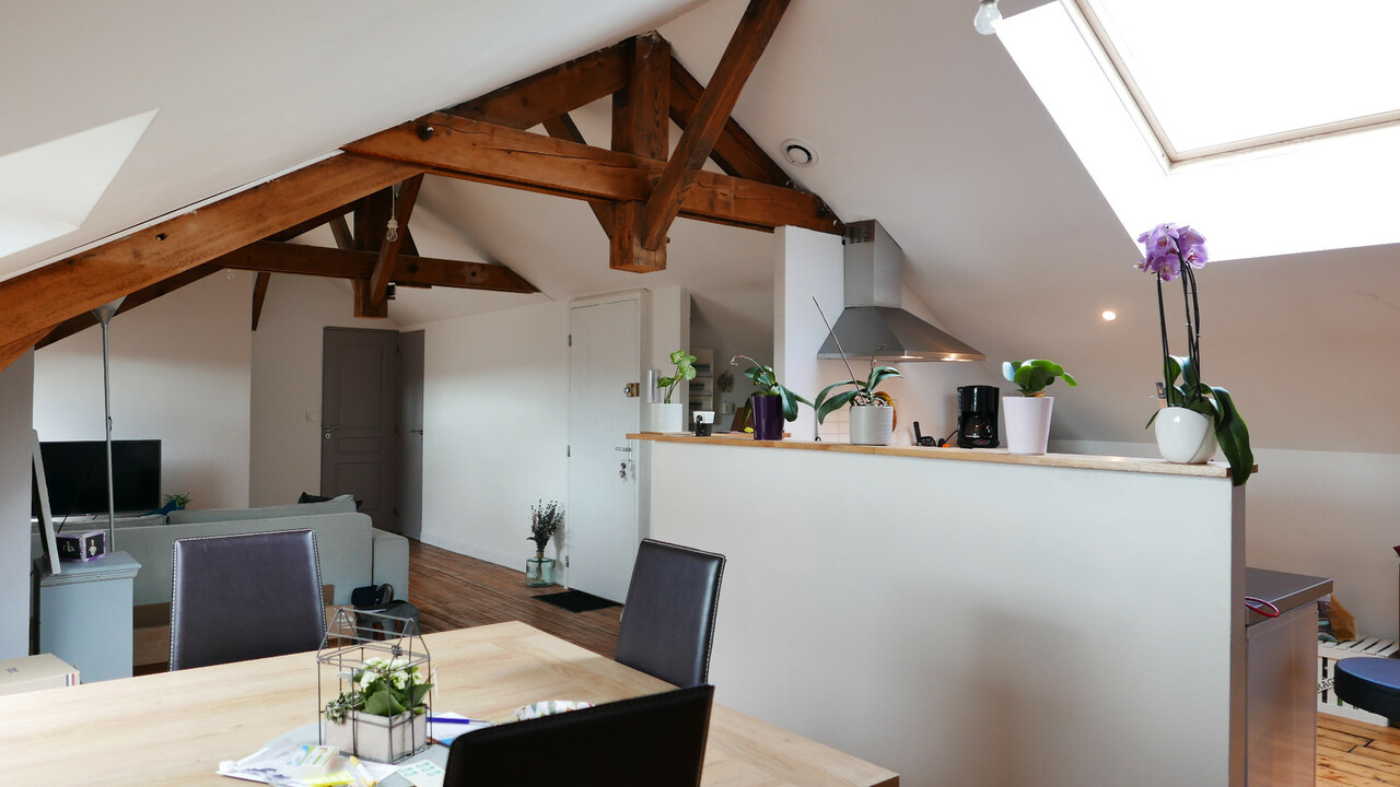 Au troisième et dernier étage d'une petite copropriété, bel appartement type 4 ( 113 m2 au sol, soit 64,58 m2 loi carrez ). Vaste séjour avec cuisine ouverte équipée, 2 chambres, bureau, salle de bain et douche, WC. Excellent état, rénovation complète et isolation récentes ( 2011 ). Cave - Faibles charges - Charme, calme et luminosité.