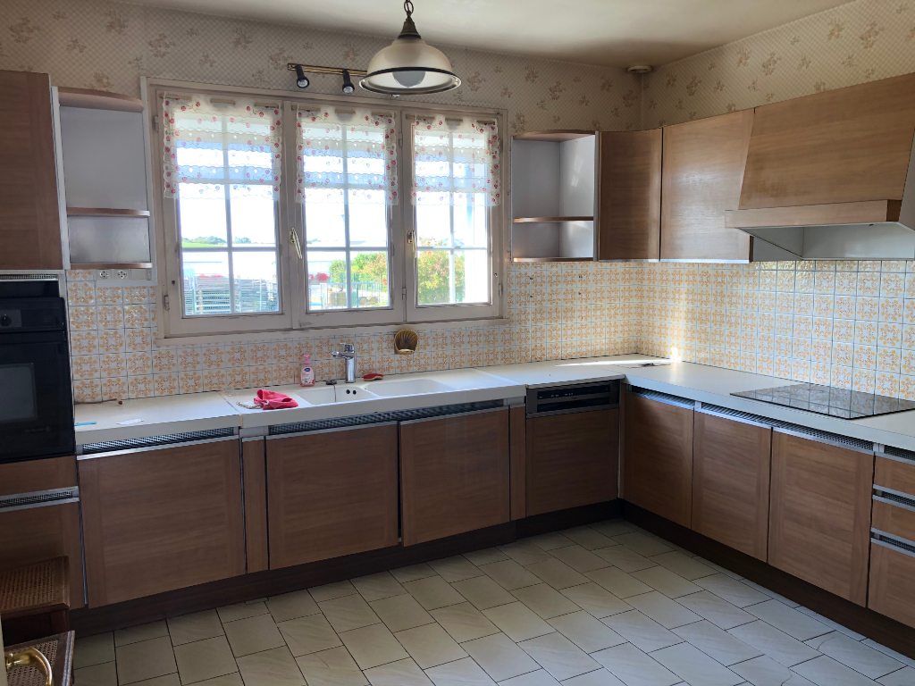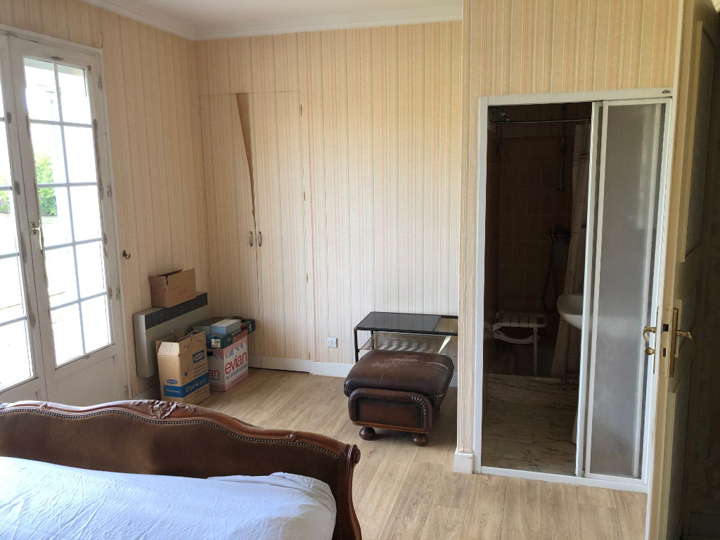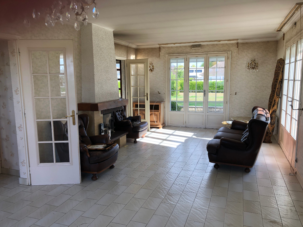 A vendre, une maison individuelle sur une grande parcelle de terrain comprenant une entrée, un salon-séjour, une cuisine, quatre chambres, une salle de bains, une salle de douche, un bureau, débarras, sous-sol total avec partie garage, atelier, buanderie et cave. Prévoir travaux de rafraîchissement.