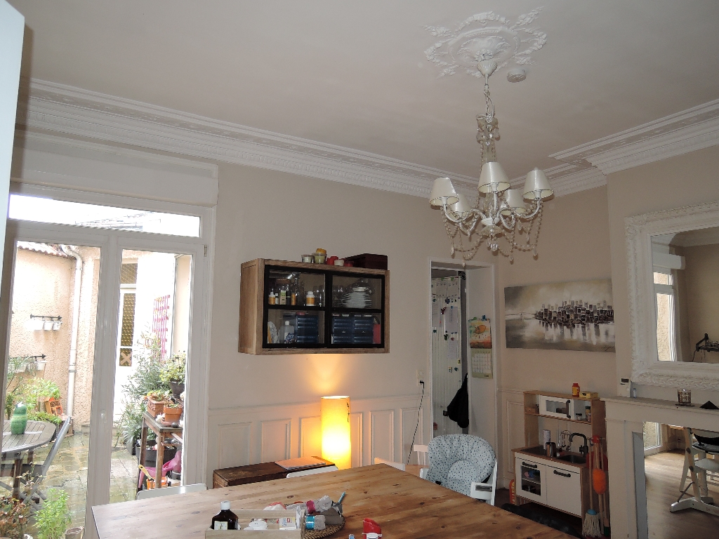 Cette belle maison familiale de 170 m² offre au RDC une entrée, un salon séjour traversant avec moulures et cimaises, une cuisine, un bureau, WC et une cour végétalisée sans vis à vis, bien exposée.