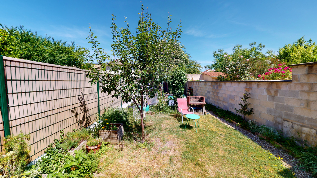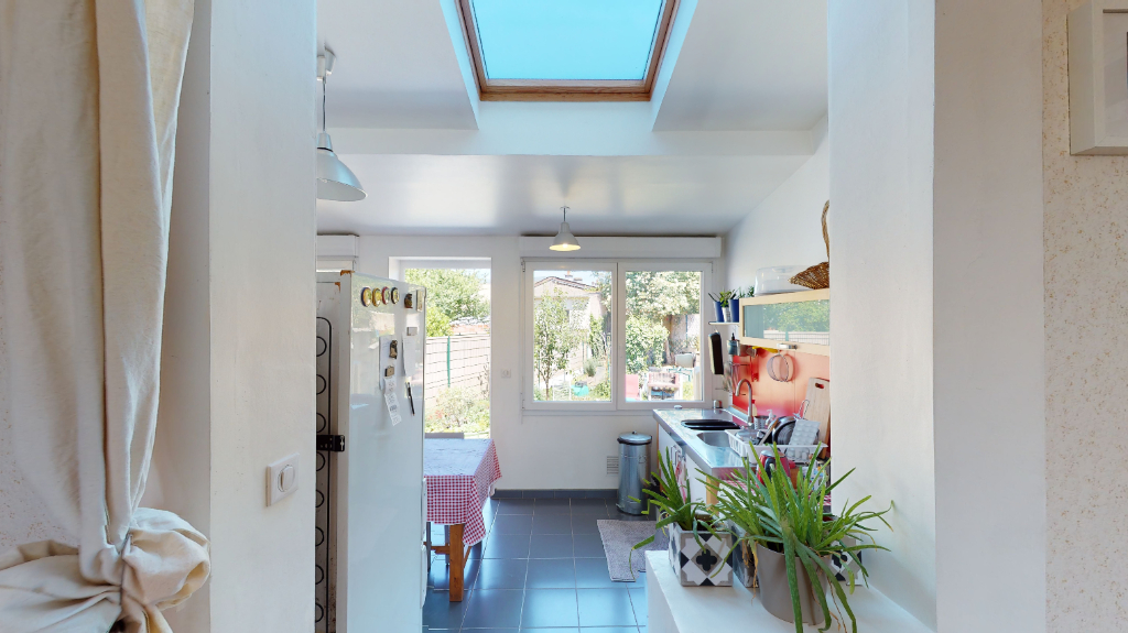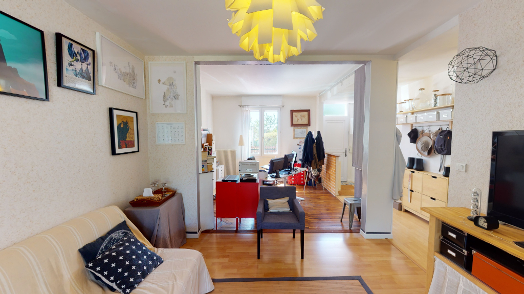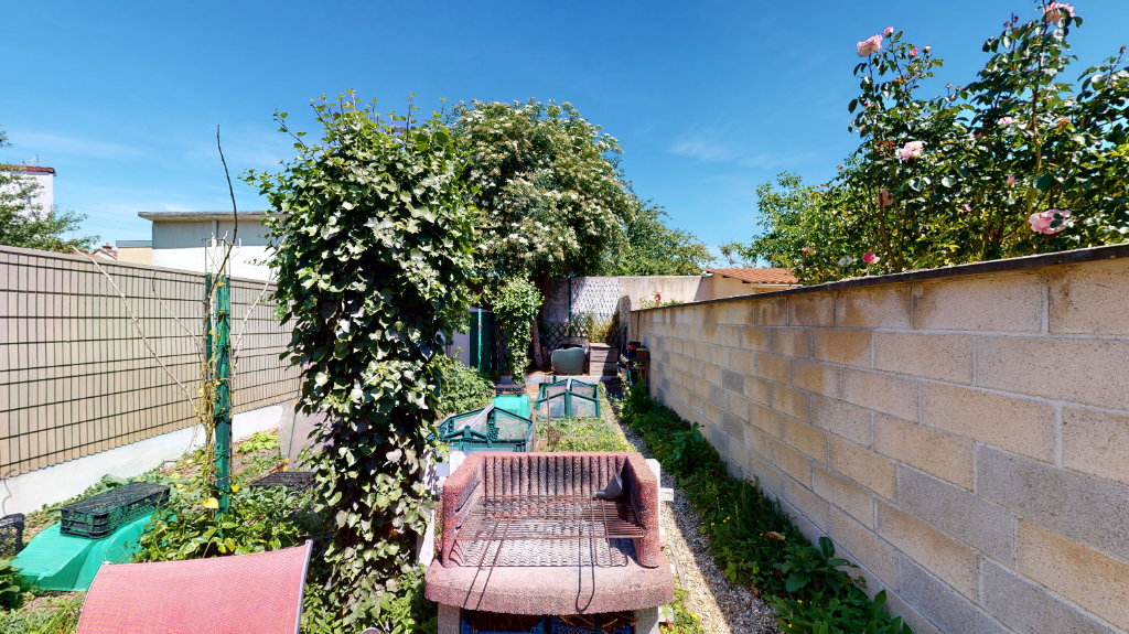 Maison des années 20 de type 4 avec Jardin comprenant au RDC : une entrée desservant un salon/séjour, avec parquet ancien et belle hauteur de plafond, une cuisine et son coin repas donnant sur le jardin, SDB, WC.